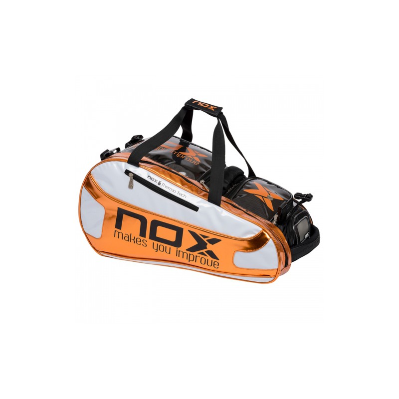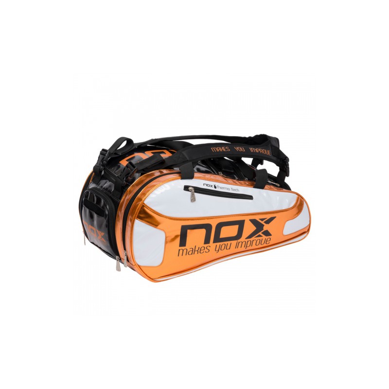 Paletero Nox Thermo en colores blanco y naranja, un paletero diseñado para alojar hasta 2 palas de pádel, con compartimento para la ropa y además bolsa interna para guardar las zapatillas o chanclas de ducha, el paletero más completo de Nox para 2017.