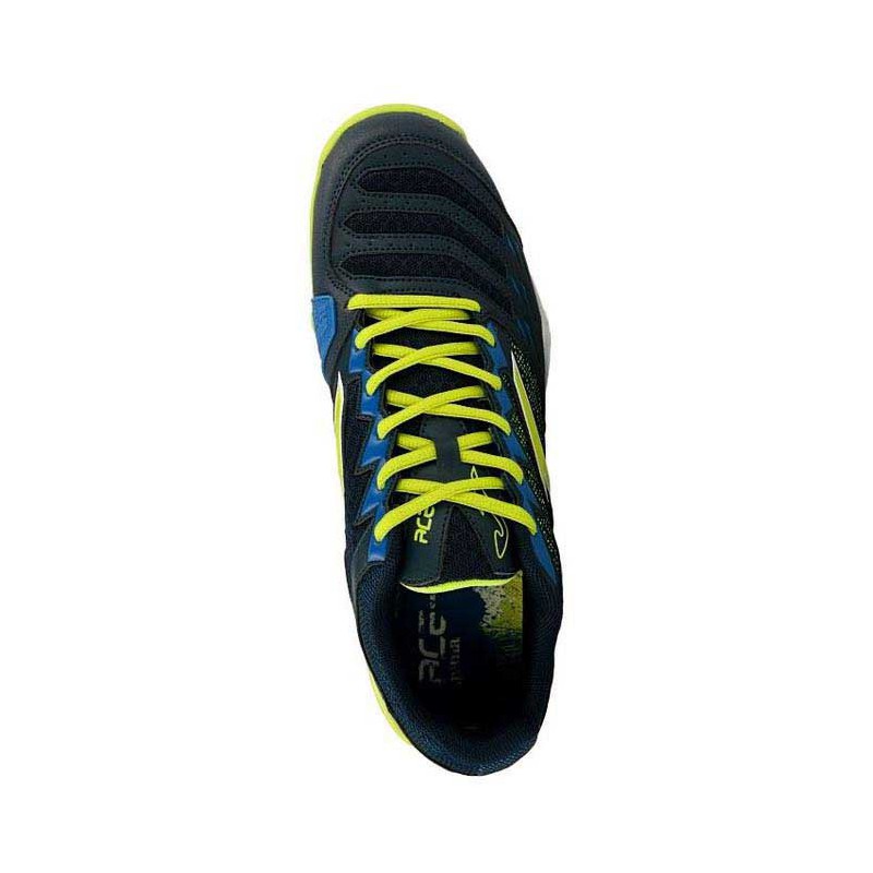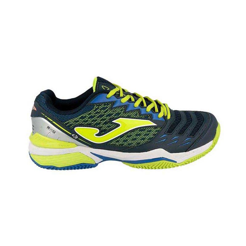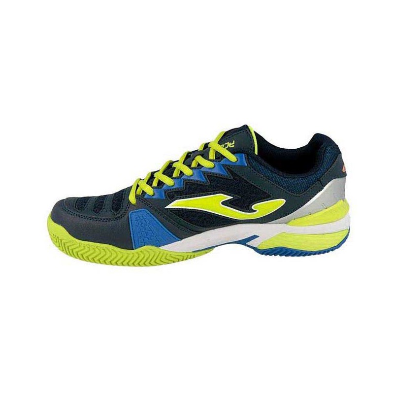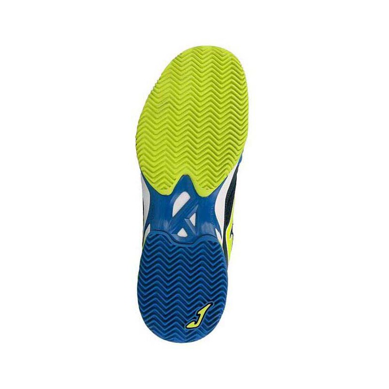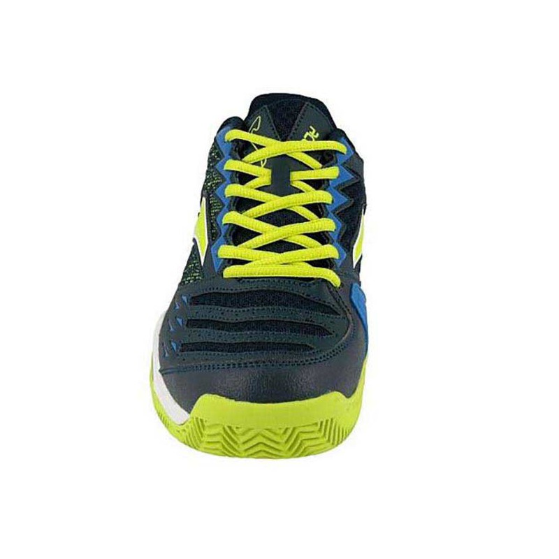 Zapatilla de padel Joma azul y amarillo. Suela de espiga o clay que mejora la adhesión al terreno y disminuye los deslizamientos en pistincorpora su plantilla interior Eva que contribuye a la amortiguación y comodidad.
